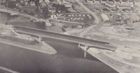 Foto aanleg N348 bij IJsselbrug in De Steeg, vlak voor opening maart 1974. Burg. Dr. G.W.B. Borrie verrichte de openingshandeling van de Rijksweg R-38. Nadien een provinciale weg met naam 'IJsselweg' de N348. Op foto is te zien dat ook nog aan brug werd gewerkt. Goed is een (groot) van De Steeg te zien en haven naast de brug Geplaatst 27-2-2017.