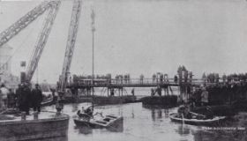 November 1924 stortte op de schipbrug tussen Doesburg en Dieren een locomotief in de IJssel. Een duiker is de IJssel ingegaan om een staaldraad aan het gevaarte te bevestigen en werd de GTW locomotief opgehaald. Op foto is te zien dat de locomotief al gedeeltelijk boven water kwam. Vanaf de brug keken belangstellenden naar het interessante werk. Machinist Buunk zag kans van de loc af te springen en kwam op één der schepen terecht. Hij kreeg bijnaam onderzeeër. Geplaatst 20-5-2017.