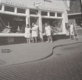 Winkel van drogist Gastelaars Groenestraat 56 met personeel in/omstreeks jaren zestig. Nu Dierenspeciaalzaak 't Knagertje. Dames schijnen lol te hebben om op foto te komen. Gastelaars was een alom bekende drogisterijfamilie. In Dieren en Doesburg beide in de Kerkstraat zat ook drogist Gastelaars. Winkelhuis in Groenestraat is 1937 verbouwd en in 1946 is achter een schuur gebouwd. Hiernaast de huidige situatie. Geplaatst 28-02-2015.