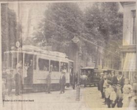 Oud knipsel dat op de grens van Velp de paardentram en elektrische tram 1 elkaar in 1911 ontmoeten. Geplaatst 29-7-2017.